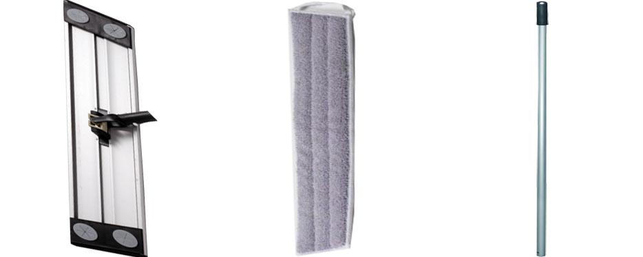 Komplektas grindims valyti susideda iš perforuoto rėmo 40 cm, mikrofibrinio šluosto 40cm ir aliuminio koto 140cm su plastikine rankena.