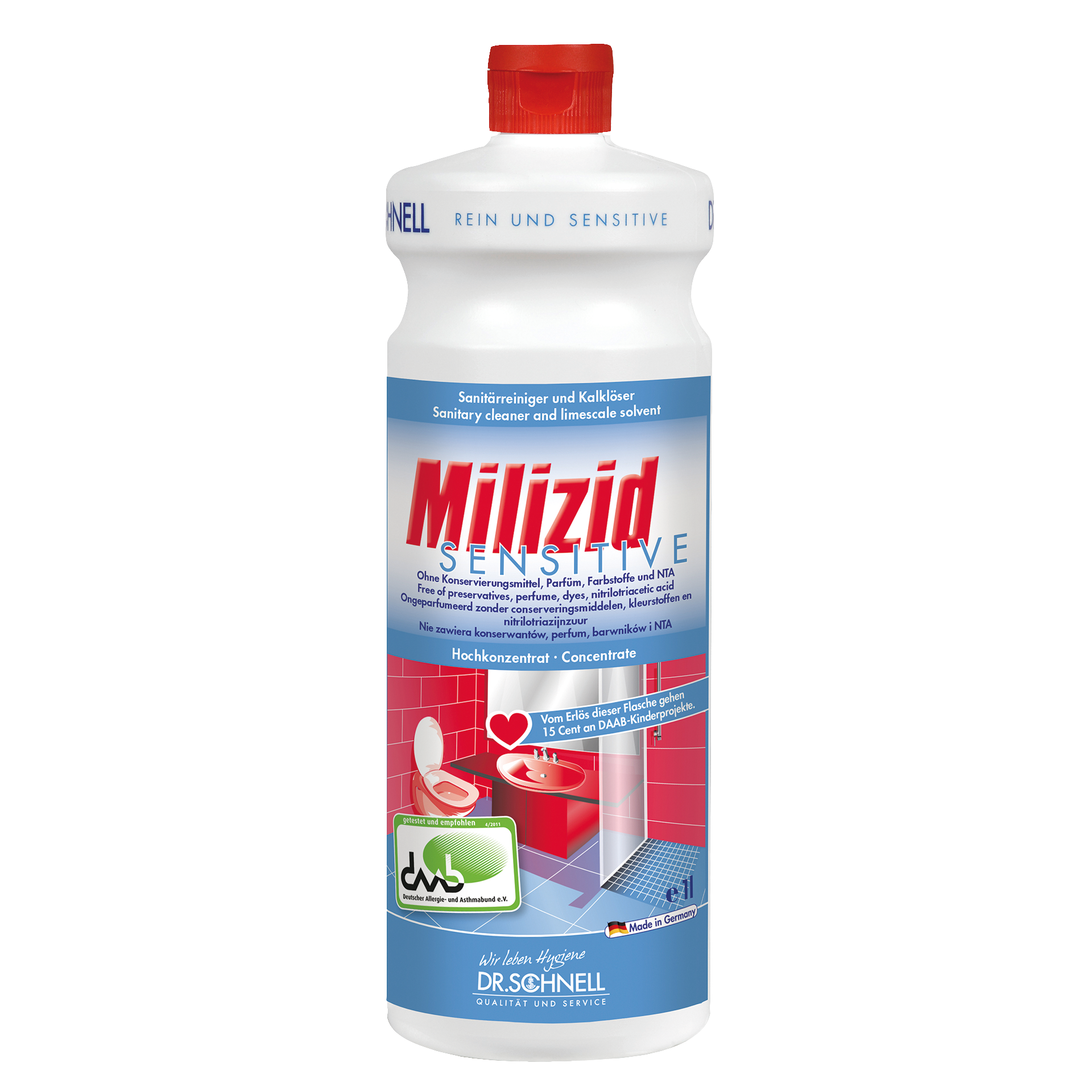 MILIZID SENSITIVE – tai ypač efektyvus kalkių nuosėdų valiklis alergiškiems žmonėms, turintiems jautrią odą ar uoslę. Priemonė pašalina mineralinius ir organinius nešvarumus, tokius kaip kalkių nuosėdos, muilo, kosmetikos, šlapimo, rūdžių, cemento likučiai. MILIZID SENSITIVE tinkamas naudoti ant porceliano, nerūdijančio plieno, chromo, plastiko, keramikos, gumos, rūgščiai atsparių plytelių, stiklo. Nuvalo praustuvus, plastikinius vonios elementus, dušus, vonias, tualetus. MILIZID SENSITIVE naudojamas baseinuose, mokyklose, darželiuose, biuruose, parduotuvėse ir ligoninėse. Priemonė neturi chloro, druskos, acto ir fosforo rūgščių.
