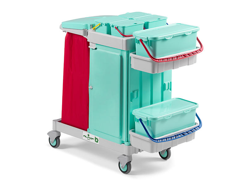 Standartinė komplektacija: keturi plastikiniai kibirėliai 4x4l, du kibirai 2x20l. Yra didelė ir patogi dėžė su stalčiai ir užraktu chemijai susidėti. Matmenys: ilgis x plotis x aukštis 118 x 58 x 112. Svoris 25.37kg.