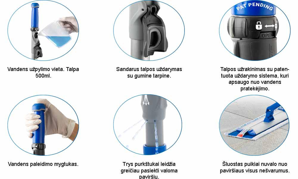 SPRINTER grindų valymo kotas yra skirtas nedidelių patalpų greitam ir patogiam plovimui. Jums nebereiks nešiotis sunkių kibirų ir lankstytis, norint nugręžti šluostą. Valymo principas dirbant su SPRINTER technologija yra pagrįstas kuo greitesniu ir kuo mažiau pastangų reikalaujančiu darbo principu. Prieš pradedant darbą į kote esančią talpą įsipilate tirpalo grindims valyti ir pradedate darbą. Šluostas sušlampa priklausomai nuo to, kiek išpurškiate vandens iš koto, taigi Jūs turite drėgną šluostą, kurio nereikia gręžti, nes jis nėra permirkęs ir varvantis nuo vandens. Valymo metu nuolat padrėkinant šluostą Jūsų grindys yra išvalomos su minimaliu kiekiu vandens, paviršius greičiau išdžiūsta ir Jūs vėl galite drąsiai vaikščioti nebijodami paslysti ant šlapios slidžios dangos.