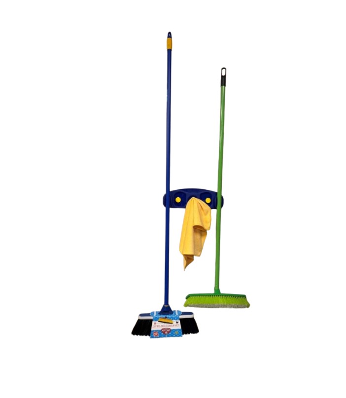 Sieninis laikiklis dviem grindų įrankiams su kotu ir kabliukas semtuvėliui.