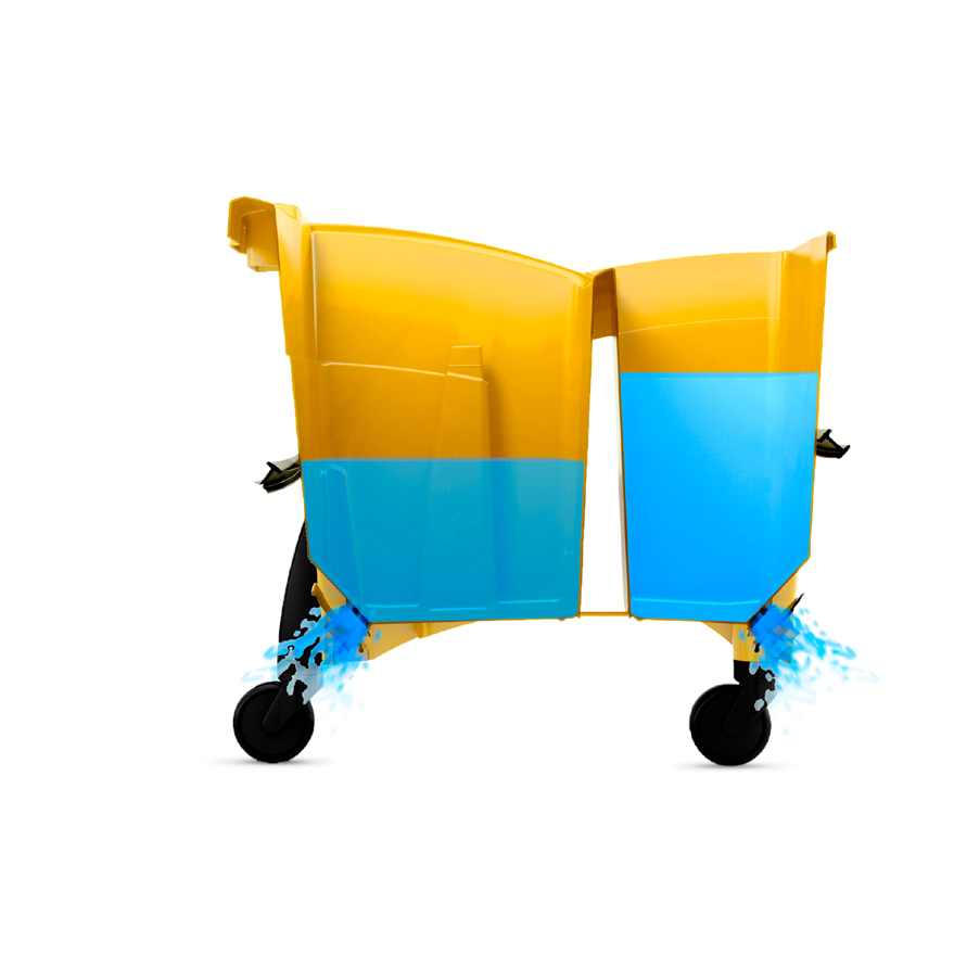 Vieno kibiro vežimėlis su pertvara vandens atskyrimu, kad nesimaišytų purvinas ir švarus vanduo. Tai pat turi dvi vandens nuleidimo žarneles. Matmenys: ilgis x plotis x aukštis 38 x 58 x 90. Svoris 6,2kg.